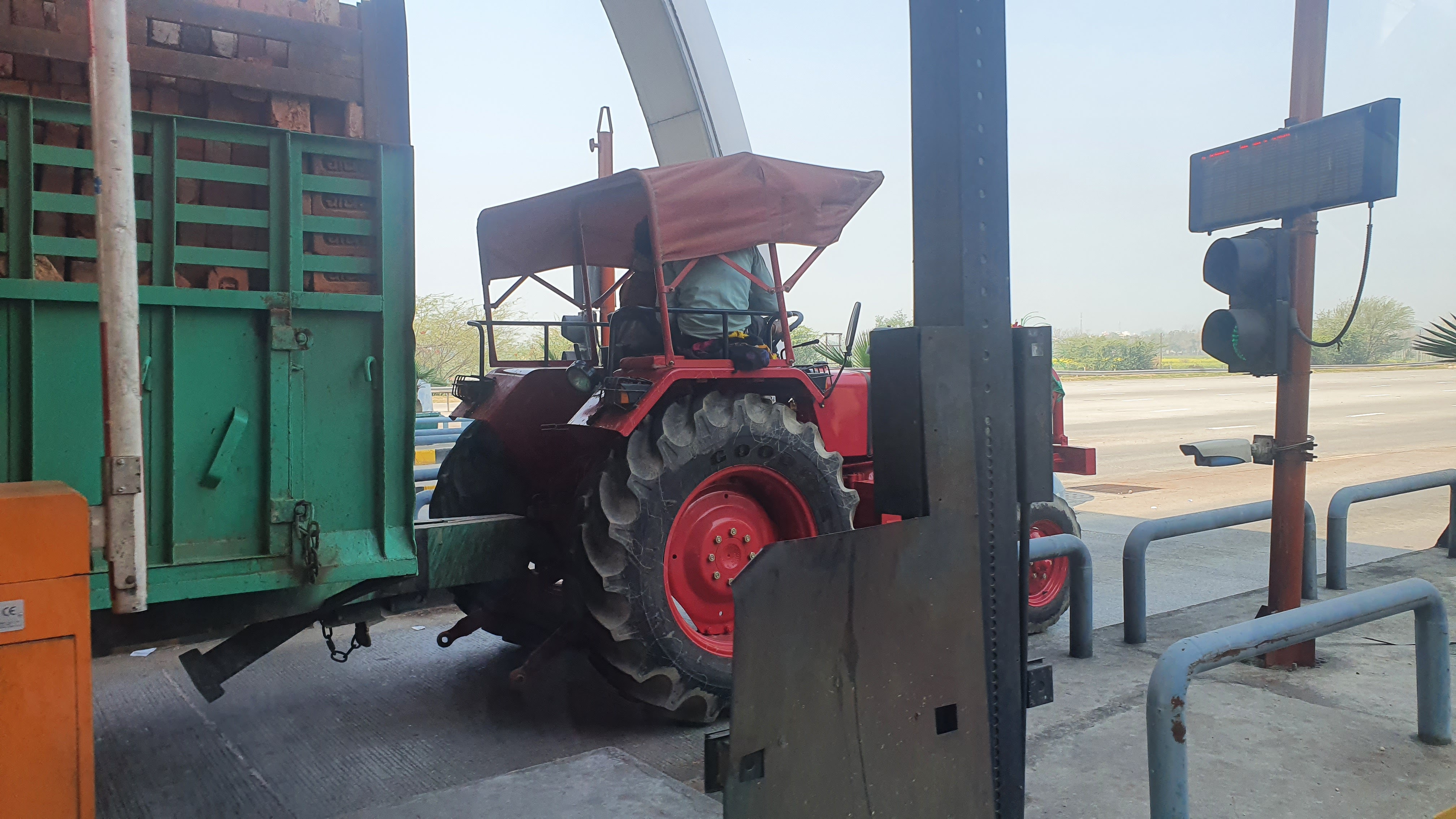 Sur l’autoroute Agra-Delhi, au pĂ©age… JĂ©rĂŽme se demande si les tracteurs ont des tarifs prĂ©fĂ©rentiels et s’ils ont le temps de passer avant que la barriĂšre ne se referme đđđ.
