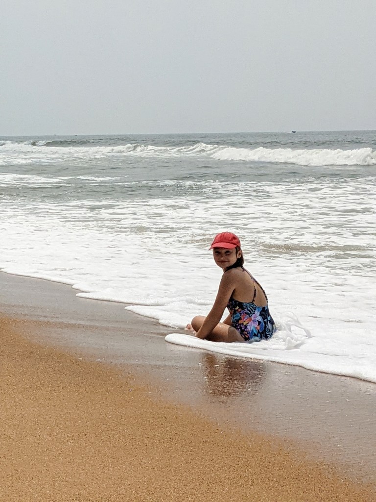 Jâai beaucoup marchĂ© sur la plage, les pieds dans lâeau. Elle Ă©tait cool la mer de Goa. Les vagues Ă©taient plutĂŽt gentilles, lâeau Ă©tait chaude, plus chaude quâen France. Alors, jâai trouvĂ© que câĂ©tait facile dâaller sây baigner. Jâai mis la tĂȘte sous lâeau, jâai ouvert les yeux, je rigolais⊠Je me suis rendue compte que lâeau de la mer Ă©tait vraiment trĂšs salĂ©e.