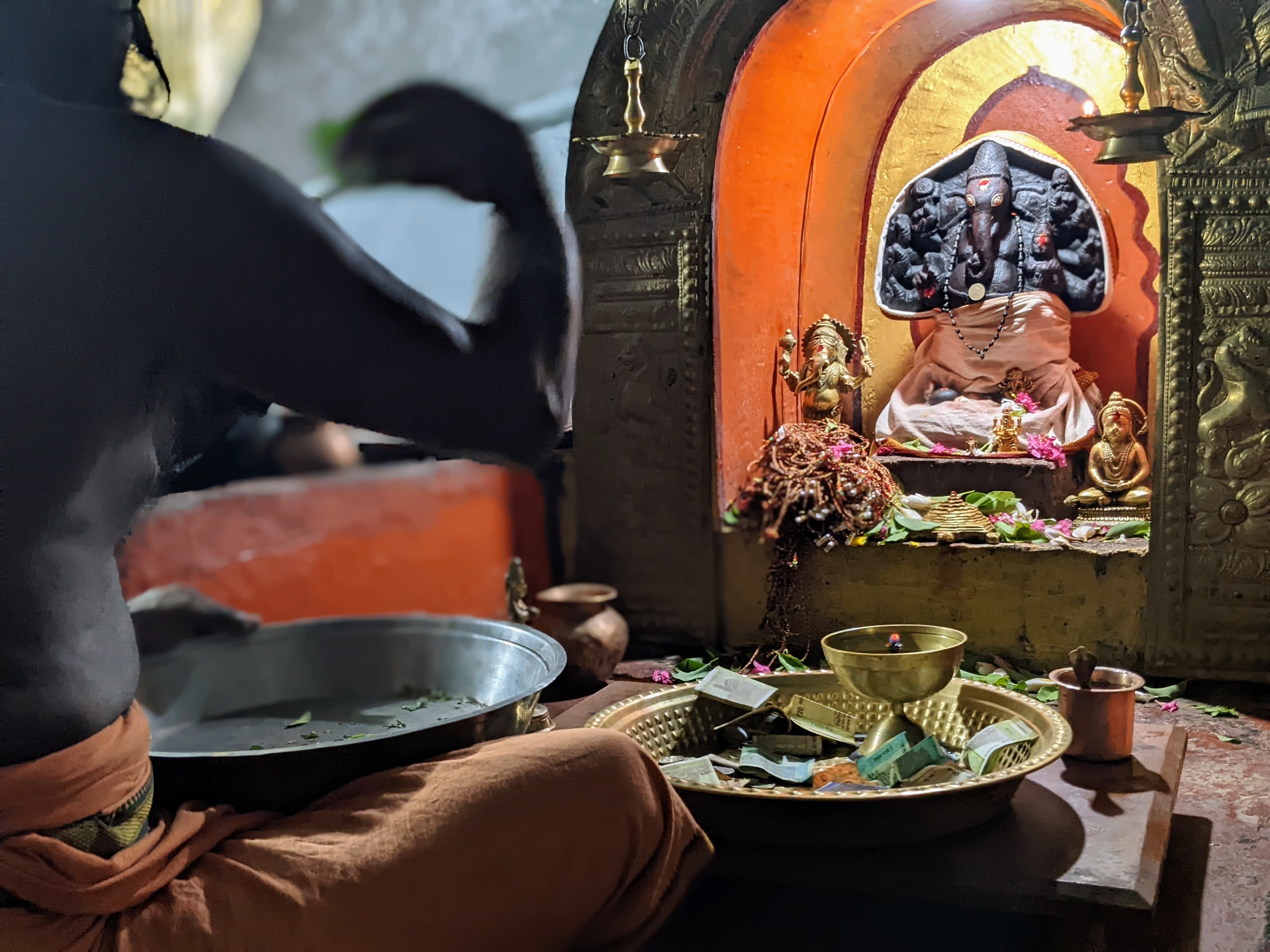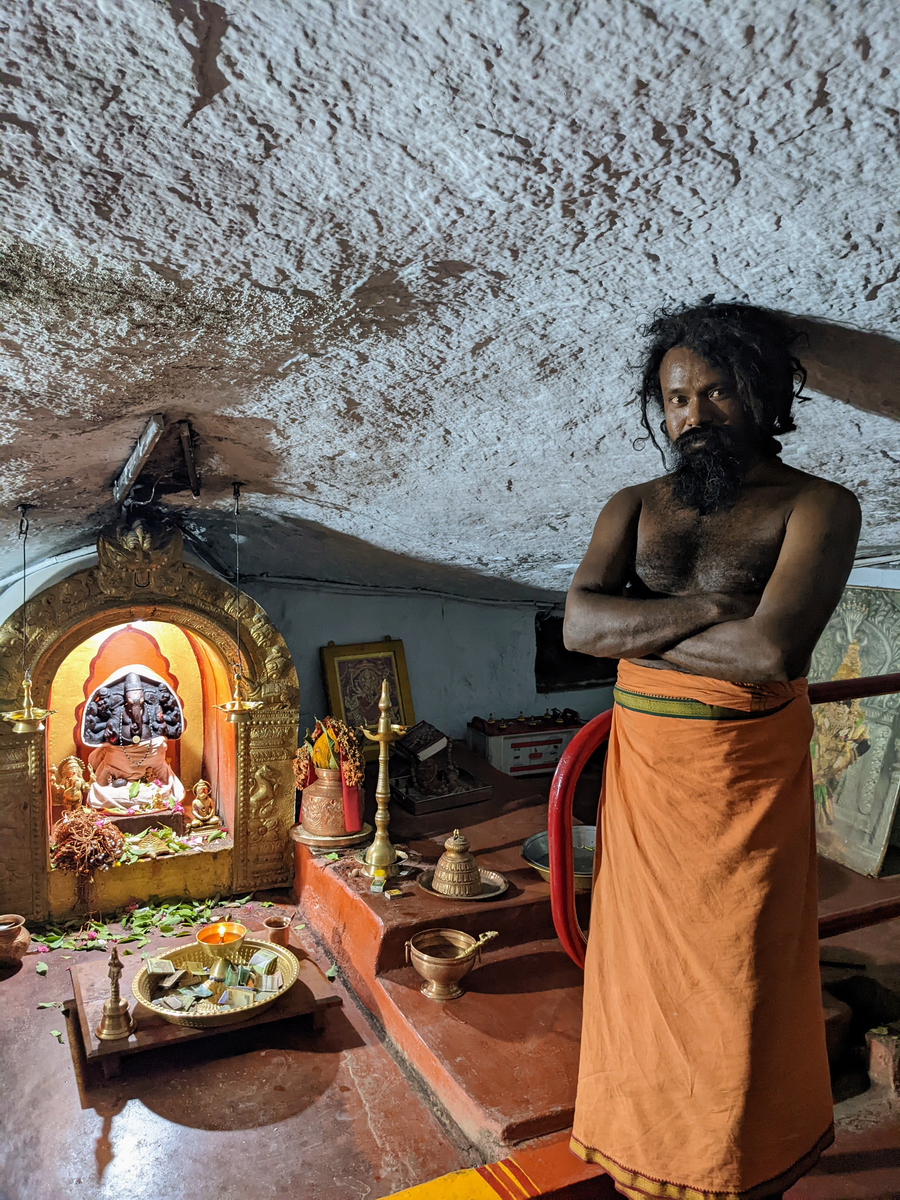 Tout naturellement, il nous a invitĂ© Ă entrer dans son lieu de priĂšre, dans la roche et avons assistĂ© Ă lâune de ses Puja (= rituel de bĂ©nĂ©diction et priĂšre). Un peu intimidant, impressionnant… le mantra invoquĂ© devient une transe qui est ponctuĂ© de rites dâoffrandes (fleurs, riz, eau, feu, argent) pour Ganesh mais pas seulement : nos prĂ©noms sont Ă©numĂ©rĂ©s, on boit lâeau bĂ©nie, on dĂ©pose le riz sur nos tĂȘtes, on nous invite Ă apposer nos mains au-dessus de la flamme et Ă adresser Ă Dieu notre priĂšre.
