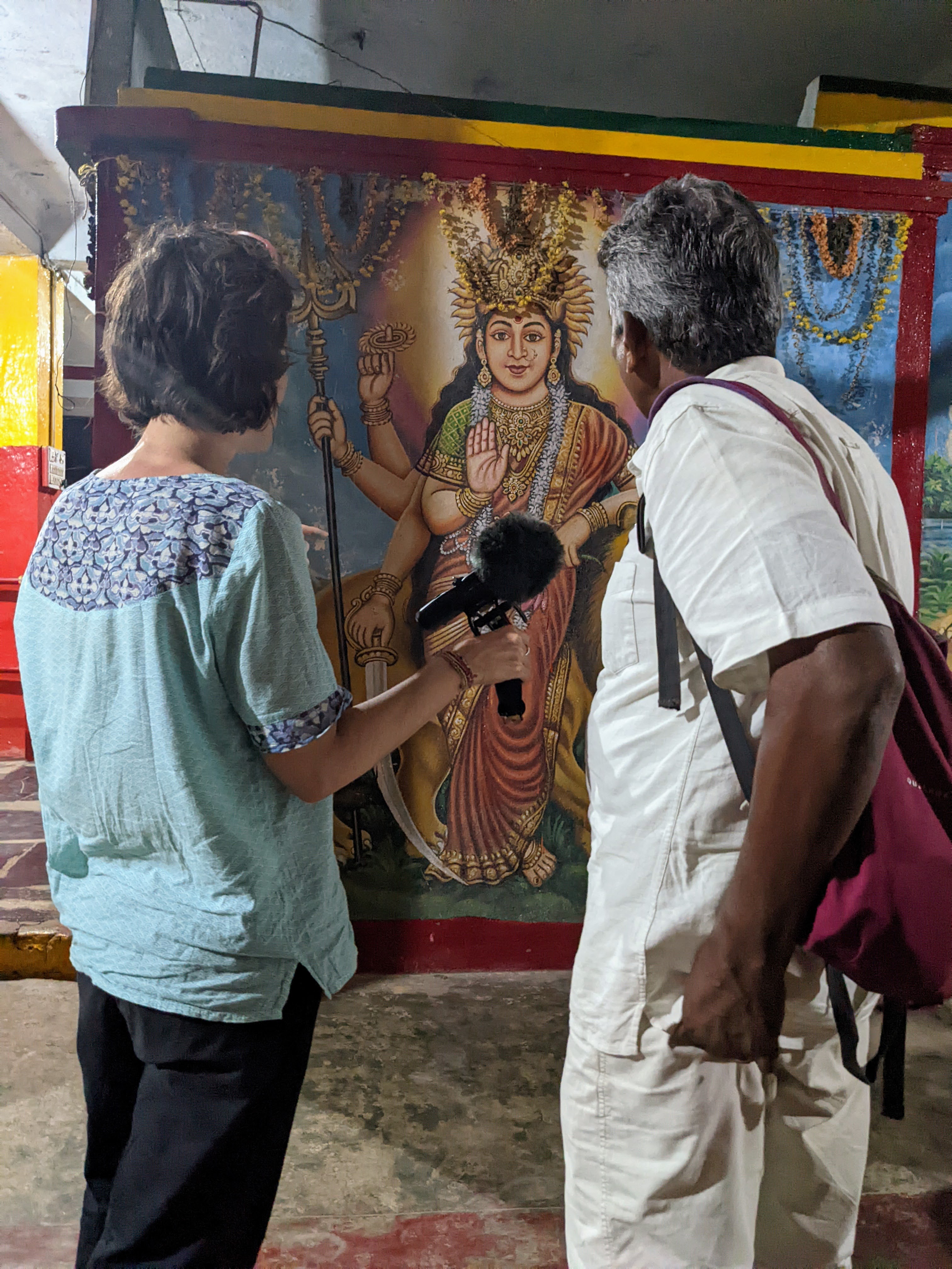 En fin d’aprĂšs midi, nous avons donc grimpĂ© une des collines alentours pour pousser les portes d’un temple dĂ©diĂ© Ă la dĂ©esse Durga. Ecoutons Emmanuelle et Raja nous raconter l’histoire de cette guerriĂšre hindou. A eux deux, on comprend pourquoi Durga symbolise la victoire et la puissance.