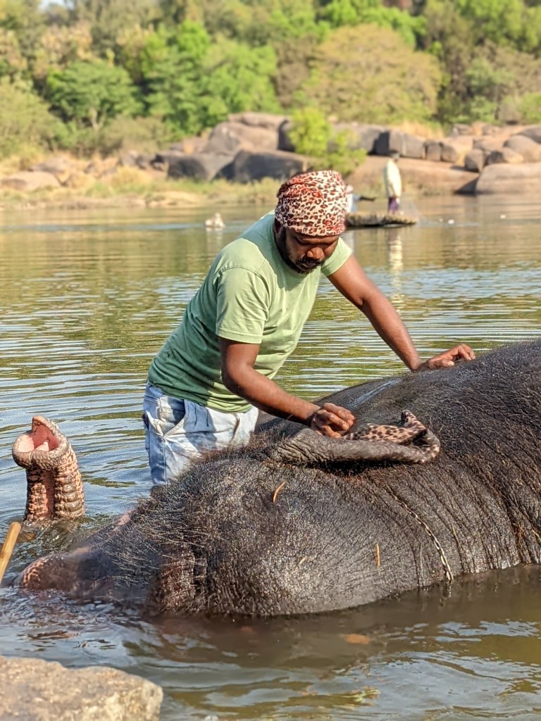 TrĂšs vite, en arrivant par la riviĂšre vers les Ghats, nous comprenons qu’une sommitĂ© fait ses ablutions. Il s’agit de Lakshmi, un Ă©lĂ©phant sacrĂ© de 46 ans qui prend son bain tous les jours aux alentours de 9h en compagnie de son cornac, le seul Ă savoir la bichonner comme il faut.