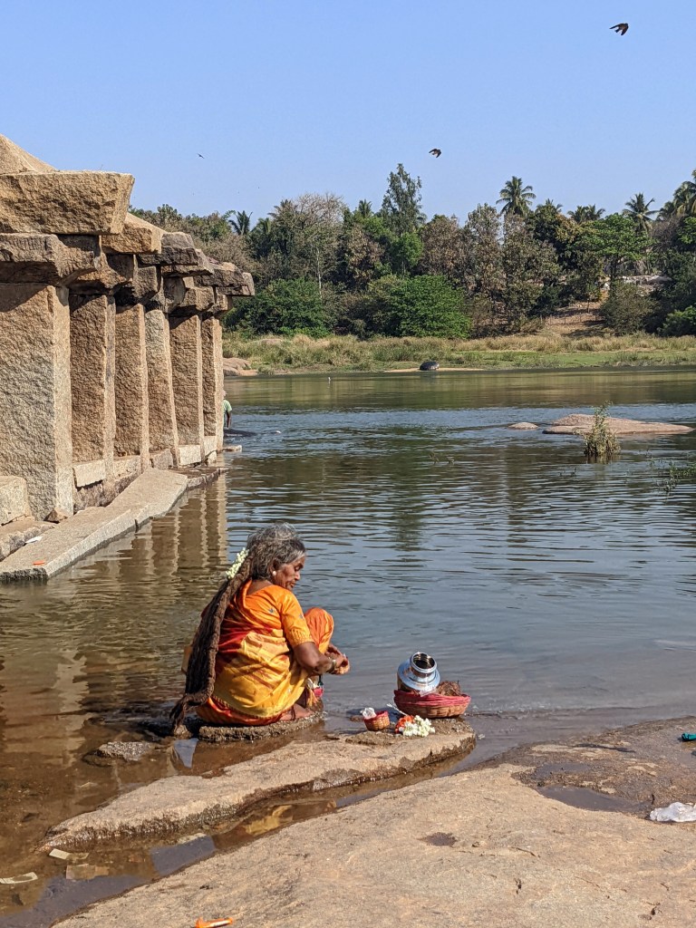 Avant de nous laisser vivre notre autonomie Ă Hampi, Raja nous emmĂšne aux Ghats d’Hampi le long de la riviĂšre Thungabadra. Il rĂ©serve une surprise aux filles mais avant cela, il nous rappelle l’importance de ce lieu qui permet aux hindous d’accompagner leurs dĂ©funts au-delĂ de leur vie terrestre.