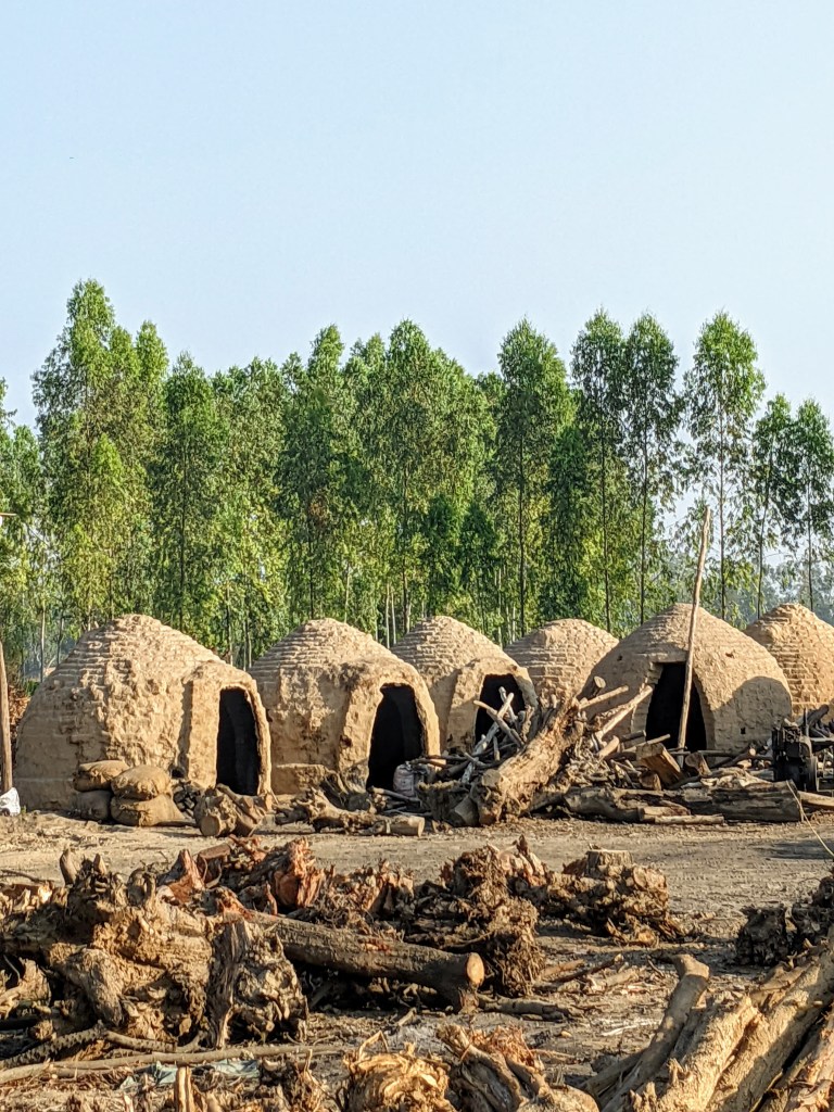 Au dĂ©tour d’une de nos balades motos dans les villages de l’Haryana, nous avons aperçu ces Ă©tranges cahutes. Ce sont des fours Ă charbon ; par site, il y en a une vingtaine et chacun produit environ 500 kg de charbon en 5 jours. A la sortie « d’usine », la tonne se vend environ 30 euros. Ce prix dĂ©risoire tient probablement au fait que tout est fait Ă la main par une ou deux familles. Les hommes au charbon pendant que les femmes et les enfants s’occupent de la maisonnette accolĂ©e aux fours qui peuvent atteindre les 500°C.